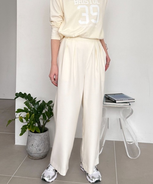カジュアルにもきれいめにも履ける万能パンツ 【point】 ・ラップ風デザインとフロントタックによるリラックス感のシルエット ・きちんと感がありながらも気負わず穿ける一本 ・腰回りが気になりづらいラップ風&タックデザイン ・ON/OFF兼用で使えます 【fabric】 ・少し張り感のあるポリエステル素材 ・さらっとした肌触り 透け感:なし 裏地:OFF WHITEのみあり 伸縮性:なし 光沢感:なし 生地の厚さ:普通 【注意事項】 ・画像の商品はサンプルです。 実際の商品と仕様、加工が若干異なる場合があります。 ・サイズ表記はあくまで目安となります。 ・取り扱いについては、商品についている品質表示でご確認ください。 ・照明の関係により、実際より明るく見える場合がございます。またパソコンなどの環境により、製品と画像のカラーが若干異なる場合がございますので、予めご了承くださいませ。 ■お気に入り登録がオススメです!■ 《商品のお気に入り登録》 カラー・サイズ選択の横の「♡」をクリックで簡単に登録できます 完売カラーの再入荷や在庫が1点になったとき、セールになったときに通知をお届けします 《ブランドのお気に入り登録》 ページ上部のブランド名の「♡ お気に入りブランドに追加」をクリックで簡単に登録できます 新商品の情報やイベントなどお得な情報をいち早くお届けします 是非、ご登録お願いします♪