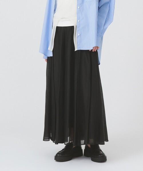 トレンドの透け感で軽やかさを纏う、主役級スカート ■デザイン 微光沢のある上質なシアー素材を使用した、エアリーな雰囲気漂うロング丈のフレアスカート。歩くたびにドラマチックに揺れるシルエットが、大人の女性らしさを引き立てます。 表情豊かな素材感と洗練されたデザインで、シンプルなTシャツやニットと合わせるだけで、こなれ感のある旬のスタイリングが完成します。 ■ディテール 昨年大好評を博したシアーボリュームスカートが、待望の再登場。 軽やかな薄手のシアー生地はそのままに、計算された三角マチを施すことで、贅沢なボリューム感と上品な落ち感を両立させました。 後ろウエストゴム仕様のため、ストレスフリーな着心地を実現。春夏に映える爽やかなイエローやブルー、着回し力の高いベーシックなブラックの3色展開です。 ■コーディネート カジュアルからきれいめまで、幅広い着こなしに対応。 ロゴTシャツやスニーカーを合わせた大人カジュアルなスタイルから、ブラウスやヒールを合わせたフェミニンな装いまで、シーズンレスに活躍します。タックインすることで、よりスタイルアップした着こなしに。 ■サイズ 足首まで隠れるロング丈。 ウエストバックゴムがしっかりフィットしつつ締め付けないため、一日中快適に過ごせます。体型を拾わないふんわりとしたシルエットで、体型カバーも叶う1枚です。 ■素材 透け感を楽しめる表地に対し、安心の裏地付き。 インナーを気にせず、シアー素材特有の軽やかさと透明感を安心してお楽しみいただけます。 ■ケア方法 洗濯可(詳細は商品についている品質表示ラベルをご覧ください) BEAMS STAFF:H163 Size:1 ※光の当たり具合やパソコンなどの閲覧環境によって、実際の色味と異なって見える場合がございます。予めご了承ください。 ※商品の色味は商品単体で撮影した画像をご参照ください。