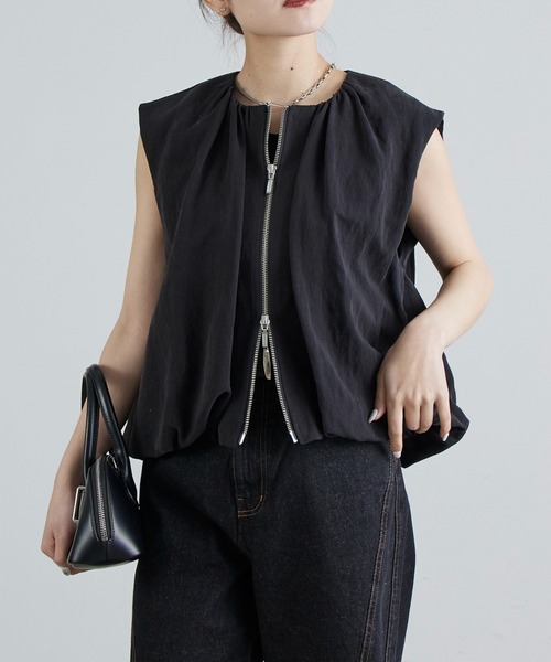 ☆2026春夏☆Lui’s FEMME 【Material】艶やかなナイロン素材でカジュアルになりすぎず、モードに使いやすい素材。薄手で落ち感のある生地でボリュームたっぷりでも軽やかに仕上げました。【Design】ギャザーたっぷりのバルーンシルエットが可愛いベスト。ショルダーのシルエットにこだわり、可愛いだけではないモードな雰囲気。シルエットを際立たせるために、ディティールを削ぎ落しミニマルに仕上げました。【Color】使いやすいブラックと、さわやかなアイボリーの二色展開。---------------透け感:なし裏地:あり伸縮性:なし光沢感:ややあり生地の厚さ:やや薄手ポケット:なし---------------《商品画像について》ご覧頂いている商品の写真につきましては、できるだけ実物の色に近くなるように努めておりますが、お使いの環境(モニター、ブラウザ等)の違いにより、色の見え方が実物と若干異なる場合がございます。 予めご了承ください。《予約商品について》・こちらの商品はサンプルでの撮影・計測となっております。実際の商品とは、商品の一部仕様が変更になる場合がございます。・撮影サンプル品はブランドタグがついておりません。製品にはタグがつきますので、製品の表に縫い糸が見えたり、着用時にタグが透ける場合がございます。・サンプルの為、混率の詳細が確定しておりません。確定次第、記載いたします。・工場の生産の都合上、納期が変更になる場合がございます。発送日の前後についてはあらかじめご了承ください。・入荷状況により、お客様への発送が店頭販売より遅れる場合もございます。・店頭に陳列していた商品も含まれる場合がございます。《ハートをタップして商品のお気に入り登録》登録カラーの商品の「残りわずか」「再入荷」「値下げ」通知を受け取ることができます。各ショップアプリにてブランドフォロー 新商品などの入荷情報、最新のニュースやお得な情報を受け取ることができます。