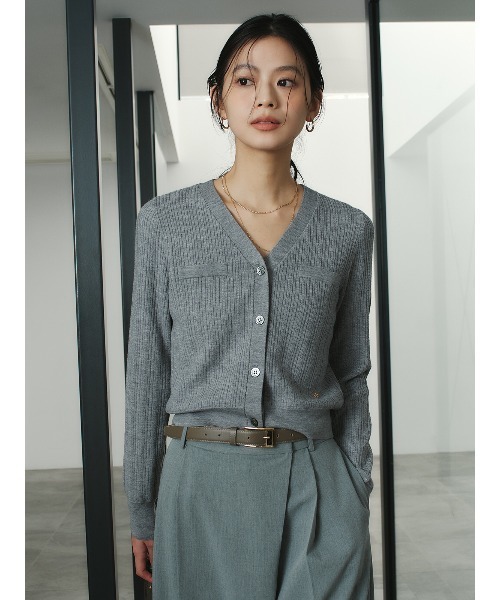 立体的なケーブルと繊細なアイレットが魅せる、センシュアルな大人のニットカーディガン■ Design柔らかなカーブを描くVネックがデコルテを美しく見せほどよい抜け感を演出してくれます。コンパクトな丈感でどんなボトムともバランスが取りやすく、着回し力も抜群。ベーシックでありながらも、繊細な表情のある編み地がスタイリングにエレガンスなニュアンスを添えてくれます。さらにオリジナルのジュエリーロゴボタンが上品なアクセントとなり、デイリーからオフィスシーンまで幅広く活躍してくれる一枚です。■ FabricSudwoolle社のイタリア企画《Biella Yarn(ビエラヤーン)》を使用したラグジュアリーな素材です。17.5マイクロンの非常に細い2/60のエクストラファインメリノ糸により、カシミヤ級の滑らかで柔らかい肌触りに仕上がっております。さらっとしたタッチで通気性も良く、 吸湿性にも優れているため、夏の汗ばむ季節でも蒸れずに快適に着用できます。尚且つ、地球環境に配慮した生産工程で作られたBiella Yarnは贅沢なまでのソフトな風合いと着心地の良さを表現しております。■ Coordinateネックに抜け感があるので釦を閉めてトップスのようにもご着用いただけます。同じ糸で編み立てたハーフスリーブニットプルオーバーと合わせたアンサンブルのスタイリングもおすすめです。===================================裏地:なし透け感:なし光沢感:なし伸縮:ありケア方法:手洗い機能性:保温性・吸湿性・放湿性(調温機能) 消臭・抗菌効果===================================