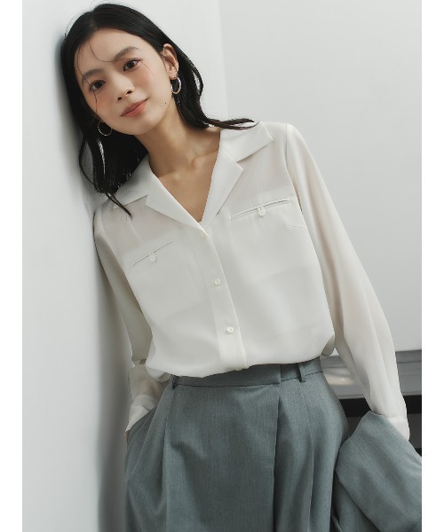 セミシアーな質感が程よい抜け感を演出してくれ、さりげなく華やぐ一枚■ Design開襟デザインがデコルテラインを美しく引き立て、やや大きめに仕立てた上衿がクラシカルなムードをプラス。シンメトリーに配置した胸ポケットがアクセントとなり、透け感のコントラストがさりげない立体感をプラス。シワになりにくくお手入れも簡単な素材なので、日常使いからオンスタイルまで幅広く活躍してくれる一枚です。■ Fabricポリエステル100%の梳毛調シアー素材。ポリエステルでありながらも天然繊維のような糸構造とすることで、ウールライクなドライタッチが再現され、自然な外観と美しい仕立て映えを両立します。ロングシーズンお使いいただけるイージーケアな素材です。※MADE IN JAPAN FABRIC■ Coordinateジャケットやアウターのインにも映えるバランスで、モードなスタイリングにもマッチします。===================================裏地:なし透け感:ややあり光沢感:なし伸縮:なしケア方法:手洗い機能性:接触冷感・防シワ性・通気性===================================