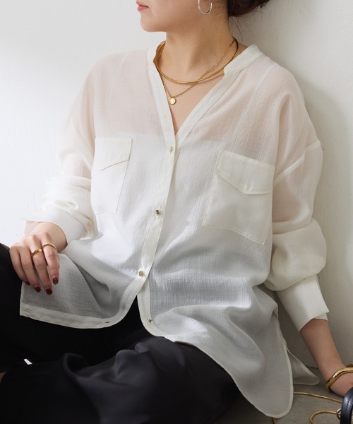 毎年大人気のヴィンテージライクシャツがブラッシュアップして再登場!!【POINT】・凹凸した表情感のある生地を使用したスキッパーデザインのシアーシャツ。・袖の内側には共地のロールアップタブを付けているので袖を短く固定することができ、ロングシーズン着やすいです。※ロールアップタブは取り外し可能・さらっとしたドライな肌触りで真夏の紫外線対策や冷房対策にも活躍します。・生地はマットな風合いなのでメタルボタンで女性らしさをプラスしました◎・前後で丈が異なり、後ろはお尻周りが隠れるのでおしゃれに体型カバーが叶います◎【おすすめコーディネート】一番下のボタンホールを重ね合わせ、内側の胸元のボタンで留めることでインせずにクロップド丈にアレンジ出来ます。スラックスやタイトスカートと合わせて通勤にもおすすめです。スキッパーネックなのでジャケットともバランス良く決まりやすいです。タイトワンピースの羽織でも、丈を変えて着ればスタイルアップが叶います◎【おすすめのスタイリングアイテム】・シェルタリングタックスカート CLZ1061301A0001・シェルタリング3タックパンツ CLZ1061302A0001 ・リラックスイージーパンツ CLS5061302A0001・ジャージマーメイドスカート CLZ1061201A0001・ジャージスリムテーパードパンツ CLZ1061202A0001・リラックススーパーワイドデニム CLZ5042203A0001【素材】本体: 再生繊維(セルロース) 70%, ポリエステル30%パイピング部分: ポリエステル100%透け感:あり裏地:なし伸縮性:なし光沢感:なしおすすめ着用時期:春、夏、秋≪返品・交換・修理について≫・着用後、洗濯後の返品・交換は致しかねます。・商品到着後、着用前に商品状態のご確認をお願い致します。・ECサイトでご購入いただいた商品は、お修理を承っておりません。【気になる商品は「お気に入り」登録を】 ハートマークをクリックし、お好きなカラーを選んでお気に入りに登録すると入荷情報や残り1点の通知、完売カラーの再入荷、セール情報などを受け取ることができます。※撮影場所やお使いのモニター環境により若干お色味が異なる場合がございます。特にロケの撮影では明るく見える傾向にございます。詳細撮影画像で色味をお確かめくださいます様お願いいたします。※サンプルで撮影をしております。若干の仕様が変更になる場合がございますので予めご了承の上ご注文くださいますようお願いいたします。※サンプルでの採寸のためあくまで目安となります。予めご了承ください。