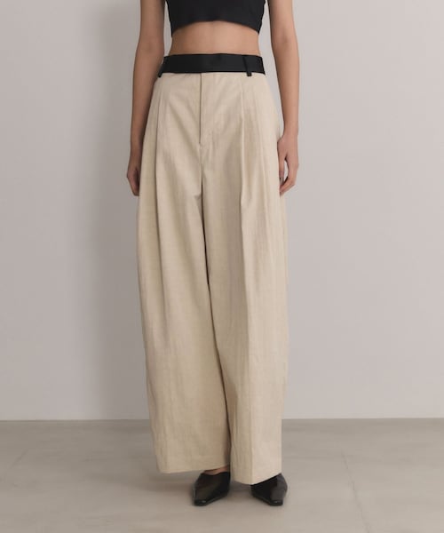 ◇2026◇ ADAM ET ROPE' EMOELLE 【Material】 コットンチノのような雰囲気のナイロンツイル素材。 程よいハリと落ち感が共存した風合いが特徴。 チノより少しきれいめでシワになりにくい素材。 【Design】 長くご好評いただいているワイドパンツ。 2タックのディティールの入った綺麗なシルエット。 ベルト部分は中肉のサテン生地を使用し、ドレスパンツのようなきれいめな雰囲気とこなれたカジュアル感をMIX。 他にはないデザインに仕上げた一着。 後ろの三角フラップもワンポイントに。 【Color】 ベーシックなブラック(02)、更に濃度をアップしたディープブラック(01)、春らしさのあるキナリ、ブルー、ピンク、落ち着きのあるカーキの6色展開。 【Styling Point】 普段のカットソーやブラウススタイルが黒ベルトにより引き締まり、スタイリングのポイントに。 トップスをボトムINしてベルト部分を際立たせるスタイルがおすすめ。 --------------- 透け感:なし 裏地:なし 伸縮性:なし 光沢感:なし 生地の厚さ:やや厚手 開き方:フロントファスナー ポケット:あり 洗濯方法:手洗い --------------- ◇モデル情報 詳細着用モデル:170cm size:38 ※その他のモデル着用サイズはサンプル丈となっております。 ※撮影時の光、お使いのモニター環境によって色の見え方が違う場合がございます。