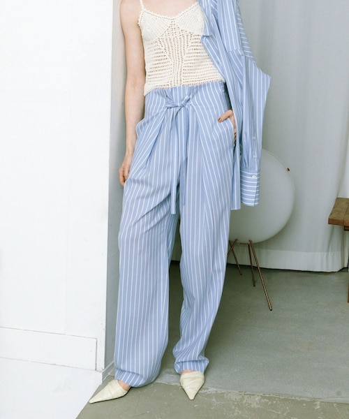 ◇26SS◇ ADAM ET ROPE' EMOELLE 【Material】 ニュージーランド産メリノウール(Super120'S)原料を使用し、尾州で織り上げた細番手のトロピカル素材。 薄手で軽く心地よいタッチとハリ感を兼備えており、 上質な落ち感が上品な仕上がり。 ウール100%でありながら、原料段階で特殊加工を施し手洗い可能な素材。 【Design】 フロントは紐でくしゅっと生地を寄せるイージーなディティールで、後ろはベルト切替のスッキリとしたスラックス。 脇は生地の重なりで奥行きが出て、体を華奢に見せてくれるデザイン。 さらっと履ける軽き着心地でありながらも、デザイン性もプラスされたスラックス。 ◇同素材にて、サマーウールシャツ(品番:GAH76000)もご用意がございます。 【Color】 クリーンなサックスストライプの1色展開。 【Styling Point】 紐の結び加減で、ハイウエストでもローウエストでも着用可能。 トップスをインしてくしゅっとさせたフロントの生地感を見せる着こなしも素敵。 --------------- 透け感:ややあり 裏地:なし 伸縮性:なし 光沢感:なし 生地の厚さ:やや薄手 ポケット:サイドシームポケット、後ろパッチポケット 洗濯方法:手洗い --------------- ◇モデル情報 詳細着用モデル:170cm size:38 ※その他のモデル着用サイズはサンプル丈となっております。 ※撮影時の光、お使いのモニター環境によって色の見え方が違う場合がございます。