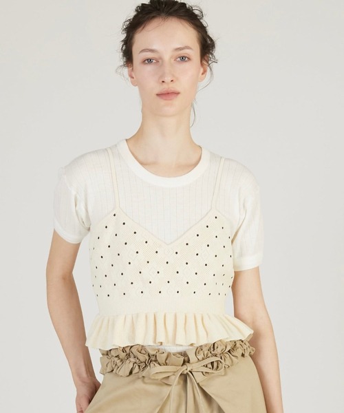 アイレット(小穴模様)やフラワー柄のジャガード生地にドットプリントを施した、オリジナル素材のニットキャミソールをお作りいたしました。裾には大ぶりのフリルをあしらい、メリハリのあるシルエットに。肩紐は調整可能で着る位置で雰囲気を変えながら様々なレイヤードスタイルを楽しめます。ニット素材で伸縮性があり着心地が良いのもポイント。上下揃えてセットアップで着ていただくと統一感があり、flower jacquard dot cardigan とアンサンブルで着ていただくのもオススメです。【crinkle crinkle crinkle】Anything your heart desireswill come to you…その時々に感じる感覚を、素直に自由に魔法をかけるように表現。自分らしく纏える、愛に溢れた服を提案します。「crinkle」=「シワ」という意味。ナチュラルなシワ感を出す工程を「クリンクル加工」と言い、インドの商品でよく見る技法です。アイロンいらずで、扱いやすくて、シワになってもそれさえ愛おしいと思えるものになるように。天然素材で表現することでクラフト感が入るので、デザイン性の高いものもカジュアルに楽しんでもらえるように。呪文のようにリズミカルでハッピーな気分になり、ブランド名が何だかわからないのが面白いというディレクターの思いから「crinkle」の単語を3つ並べて「crinkle crinkle crinkle」というブランド名に。お洋服を着ることによって今日の私は可愛いなと思えたり、裸では叶わないことを衣服が叶えてくれる。そんな呪文のように魔法がかかればいいな、という意味も込めています。【お買い物をよりお楽しみいただくために】 ■商品のお気に入り登録(ハートマークをクリック) 完売カラーの再入荷通知や、在庫ラスト1点の通知、セールの通知を受け取ることができます。 ■ブランドのお気に入り登録 新商品がUPされたり売り切れ商品が再入荷したときなど、いち早くブランドのお得な情報を受け取ることができます。是非ご利用頂き、お買い物をお楽しみください。
