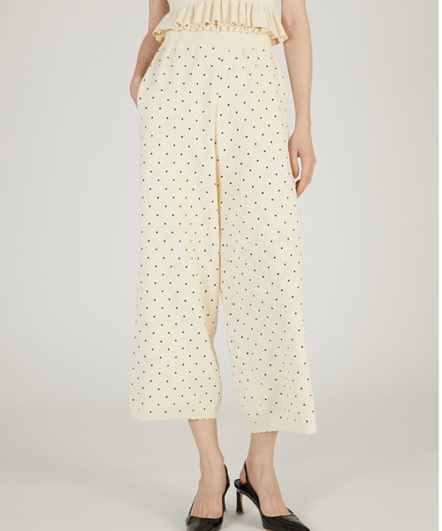 アイレット(小穴模様)やフラワー柄のジャガード生地にドットプリントを施した、オリジナル素材でニットイージーパンツをお作りしました。ウエストと裾にはcrinkle crinkle crinkleらしくフリルがあしらわれており、ワイドなシルエットがリラックスモードを演出。軽めのニット生地なので今の時期から春先まで長くお楽しみいただけます。上下揃えて着ていただくと統一感があり、単品使いでも様々なスタイリングが楽しめるセットアップです。【crinkle crinkle crinkle】Anything your heart desireswill come to you…その時々に感じる感覚を、素直に自由に魔法をかけるように表現。自分らしく纏える、愛に溢れた服を提案します。「crinkle」=「シワ」という意味。ナチュラルなシワ感を出す工程を「クリンクル加工」と言い、インドの商品でよく見る技法です。アイロンいらずで、扱いやすくて、シワになってもそれさえ愛おしいと思えるものになるように。天然素材で表現することでクラフト感が入るので、デザイン性の高いものもカジュアルに楽しんでもらえるように。呪文のようにリズミカルでハッピーな気分になり、ブランド名が何だかわからないのが面白いというディレクターの思いから「crinkle」の単語を3つ並べて「crinkle crinkle crinkle」というブランド名に。お洋服を着ることによって今日の私は可愛いなと思えたり、裸では叶わないことを衣服が叶えてくれる。そんな呪文のように魔法がかかればいいな、という意味も込めています。【お買い物をよりお楽しみいただくために】 ■商品のお気に入り登録(ハートマークをクリック) 完売カラーの再入荷通知や、在庫ラスト1点の通知、セールの通知を受け取ることができます。 ■ブランドのお気に入り登録 新商品がUPされたり売り切れ商品が再入荷したときなど、いち早くブランドのお得な情報を受け取ることができます。是非ご利用頂き、お買い物をお楽しみください。