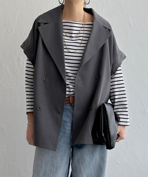 トレンチ風デザインを取り入れたミドル丈の2WAYコート。袖を取り外すことでジレとしても着用でき、季節やスタイリングに合わせた着回しが楽しめます。重ね着しやすいシルエットで、春先や季節の変わり目に重宝する一着です。【素材】落ち感のある、きれい見え素材。【デザイン】ミドル丈のトレンチ風コートです。【ポイント】袖を取り外すとジレとして着られる2WAYコート。袖の脱着はファスナー仕様なので、どちらの着方でもきれいに着られます。