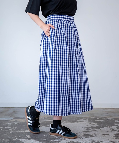 【 26Spring & Summer 】 1枚でサマになるコーディネイトの主役!大判ギンガムの軽やかフレアスカート・細番手コットンを高密度に織ったブロードギンガム・大判チェックがコーディネートのアクセントに・後ろゴム仕様で快適かつすっきり見え・タック入りAラインで美しい揺れ感<素材・デザイン>コットン100%の細番手の糸を高密度に織り上げた、ブロードギンガム生地を使用したタックフレアスカートです。なめらかで軽やかな肌触りと、適度なハリ感を併せ持ち、春・夏・秋の3シーズンで活躍する素材感が魅力。大判のギンガムチェックが、シンプルになりがちなスタイリングに程よい存在感を与えてくれます。ウエストは後ろゴム仕様にすることで、見た目はすっきりとしながらも快適な穿き心地を実現。フロントに施したタックが自然なドレープを生み、腰回りやヒップラインをさりげなくカバーします。足元に向かって緩やかに広がるAラインシルエットは、歩くたびに軽やかに揺れ、女性らしい華やかさを演出。カットソーやスウェットでカジュアルに、シャツやニットと合わせてきれいめにも対応でき、着こなしの幅が広がる一枚です。……………………透け感:なし厚さ:やや薄手ウエスト : 後ろゴム伸縮性:なし裏地:なし洗濯:可……………………コットン100%◇着用レビューH160 / 着用サイズ FREE足首が見えるくらいの着丈に、程よくフィットしたウエストです。後ろにゴムが付いているので、窮屈感がない穿き心地です。ウエストから腰はスッキリしていて、気になるお腹からフレアが効いていて嬉しい◎実際に穿くと可愛らしさに上品さをプラスしたような雰囲気なので、幅広く着回しが効き、春らしいギンガムスカートです。H163 / 着用サイズ FREEさらりとした、重みが少ないスカートです。チェック柄が、女の子らしい雰囲気を演出してくれ春夏にピッタリなスカートです◎[D.M.G / ディーエムジー]厳しい品質管理のもと、児島・さぬき市の国産工場で縫製しています。児島の洗い工場で加工を施した製品は肌馴染みの良い生地感に仕上がり、履き込むほどに独特の風合いを生み、長く味わっていただける商品となります。「デニム」・「ワーク」・「ミリタリー」といったカジュアル服の普遍的なキーワードをイメージソースに、ベーシックでありながら程良く時代と寄り添ったデイリーウェアーを提案します。お問い合わせ品番:17-0533X / 17-533X