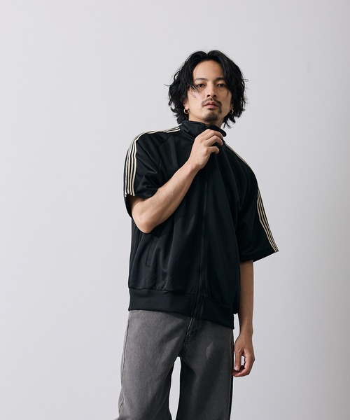 落ち着いたトーンのカラー展開とレトロな雰囲気の半袖ジャージジャケット。●程よい光沢感とハリのあるジャージ素材。●レギュラー丈、やや高めの襟元で90'sを彷彿させるシルエット●どんなコーデにも使いやすいブラック、ホワイトに加えトーンの抑えたネイビーをセレクト●インナーにリブタンクやTシャツを合わせたり、ワイドパンツやカーゴパンツと好相性◎90'sの古着のようなシルエットでありながらも今どきの匂いを感じる一枚。ストリート、スケーター、韓国ファッションにオススメで同素材のトラックパンツとのセットアップもオススメ。男性にはもちろん、メンズライクな女性にも着ていただきたい仕上がりになりました。