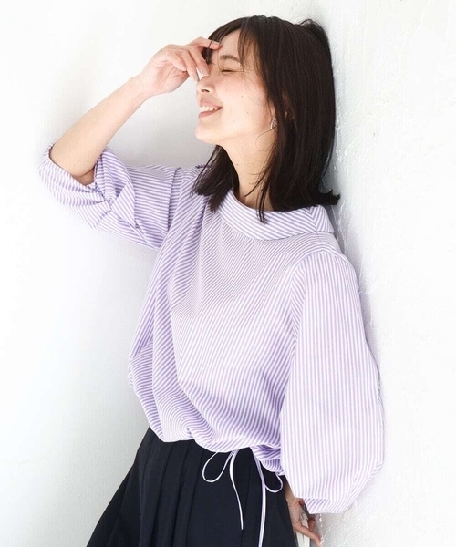一枚で映える旬デザインブラウス ■デザイン ロールネックカラーがポイントのデザインブラウス。袖下にギャザーを入れてデザインスリーブに仕上げました。丈は調節できるように脇に共地のリボン付き。 ■素材 しなやかな風合いで、毛羽の少ないクリアな表面感と心地良い肌触りが特徴の素材を使用。暑い季節にも快適に心地よく軽快に過ごせるやや薄手素材です。接触冷感機能付き。 ■コーディネート コーディネートにさわやかに映える色合いと、ストライプ・無地の2柄でアクセントに。シンプルなボトムと合わせてもすっきりと決まるクロップドの着丈はスカート、ボトムと幅広いコーディネートにおすすめです。 -------------------- 着用シーズン 春:◎ 夏:△ 秋:○ 冬:× -------------------- 洗濯表示:洗濯機洗い可 透け感:なし 裏地:なし 伸縮性:なし 生地の厚さ:やや薄手~ふつう --------------------#カジュアル #旅行 #ストライプ #ラベンダー #紫 ※自然光・照明の関係、パソコン・スマートフォンなどの環境により、実際と色味が違って見える場合がございます。予めご了承ください。商品の色味は、詳細画像をご参照ください。 ※サンプルでの撮影となるため、実際にお届けする商品と仕様やサイズが異なる場合がございます。
