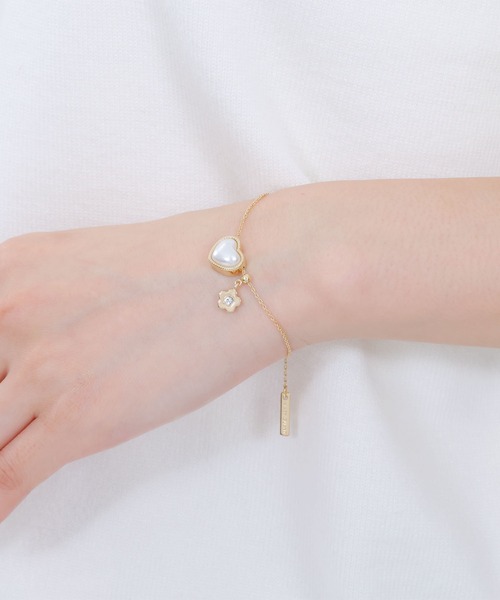 ハート型のパールがフェミニンな印象のアクセシリーズ。 ◆シリーズ共通ポイント ・デイジーはメタルで表現 ・デイジーのセンターにビジュー入り ◆アイテム紹介(ブレスレット) ・デイジーはスライドボールで位置を変更できるデザイン ・アジャスターにもスライドボールを使用