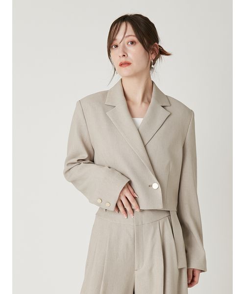 【UVカット】【今っぽいバランスを瞬時に叶える短丈ジャケットで差をつけて】【Design/Styling】トレンドライクなショート丈のコンパクトジャケット。旬なシルエットを際立たせるために肩パッドを入れて構築的に。さらに直線的なラペルラインやダブルボタンで全体の印象をシャープに整えて、大人モードに仕上げました。袖裏にはストライプ柄の裏地を使用し、袖を折り返した際のアクセントに。セットアップ着用可能なハイウエストベルトパンツ(FWFP261074)との組み合わせが特におすすめ。その他、デニムでカジュアルに楽しんだり、晴れやかなシーンでワンピースにプラスするなど、幅広いスタイリングにマッチします。色展開は3色。NVYとBLKは、ソリッドなレーヨン混ポリエステルツイル素材を使用。春夏にうれしいUVカットの機能付きです。BEGはややナチュラルな印象でリネンライクなポリエステル素材を使用しました。3色ともシワになりにくくストレッチの効いた生地で、着心地快適です。※照明の関係により、実際よりも色味が違って見える場合があります。またパソコン・スマートフォンなどの環境により、若干製品と画像のカラーが異なる場合もございます。予めご了承ください。商品の色味は、商品単品画像をご参照下さい。 ※商品画像はサンプルのため、色味やサイズ等の仕様に変更がある場合がございますので、予めご了承ください。