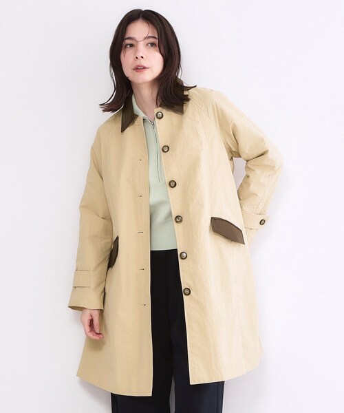 配色カラーがスタイリッシュなワークテイストのステンカラーコート【デザイン】・サラッと羽織れるAラインシルエットのステンカラーコートです。・後ろにボックスタックを入れ、動きやすさとワンポイントデザインに。・レザー調の配色襟とポケットがアクセントとなり、カジュアルながらも洗練された印象です。※前ポケット×2【素材】・程よい張りのあるナイロン素材とレザー調の素材を使用。・表面についた水をはじきやすい撥水加工付き。撥水加工は完全防水ではなく、永久的なものではありません。・ご家庭で手洗い可能です。※裏地あり【仕様】・ポケット数:前×2・裏地あり※照明の関係により、実際よりも色味が違って見える場合があります。また、パソコン・スマートフォンなどの環境により、若干製品と画像のカラーが異なる場合もございます。モデル情報:身長163cm B82 W62 H91 着用サイズ:38(M)店舗へのお問い合わせ商品番号:637-95028●製品寸法:38(M):着丈92cm B106cm 裄丈78cm40(L):着丈93cm B108cm 裄丈79cm備考:重量:38(M)約515g