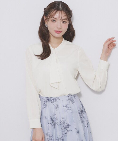 ジャケットのインナーとしてもオススメ!アシンメトリーボウタイブラウス【デザイン】・アシンメトリーで立体的なボウタイデザイン。・首周りはゆるめのVネック見えになっており、すっきりとした印象に。・ジャケットのインナーとしてもネックラインの収まりが良くオススメの一枚です。・袖口からブラウスが出ずにすっきり着用できる9分袖丈です。・カラーボトムにも合わせやすいベーシックカラー。 幾何柄とストライプと無地のアソート展開です。・やわらかな素材なのでタックインもしやすく、アウトで着用してもレイヤードのニュアンスが華やかです。【素材】・落ち感があり高見えする素材なので、ビジネスシーンにもおすすめです。・マシンウォッシャブルなので、ご自宅で簡単に洗濯が可能です。・イージーアイロン&防シワ機能付きで快適に過ごせます。※照明の関係により、実際よりも色味が違って見える場合があります。また、パソコン・スマートフォンなどの環境により、若干製品と画像のカラーが異なる場合もございます。モデル情報:身長165cm B79 W58 H86 着用サイズ:38(M)店舗へのお問い合わせ商品番号:C58-85005●製品寸法:34(XS):着丈56cm B91cm 袖丈54cm 肩幅35cm36(S):着丈57cm B94cm 袖丈55cm 肩幅36cm38(M):着丈58cm B97cm 袖丈56cm 肩幅37cm40(L):着丈59cm B100cm 袖丈57cm 肩幅38cm42(LL):着丈60cm B104cm 袖丈58cm 肩幅39cm備考: