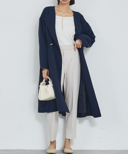 華やか春アウターは1枚二役が◎ 【Design】 ドローコードでウエストマークを調節出来るスプリングコートの登場です。ボタンレスでインのコーデを隠さずにスタイリング出来る、春にピッタリの羽織。きれいめから大人カジュアルまで幅広く活躍します。あえて身幅をたっぷりさせ、ドローコードでウエストを絞る事で大人なドレープ感を楽しめるデザインに。動きによって揺れる雰囲気はカジュアルコーデもグッとハイクラスに仕上げてくれます。 【Fabric】 細かなメランジ調の表面感のある素材で薄手ながらしっかりした印象が◎ネイビーカラーも程よく華やかさがあります。裏地は総裏で長い季節ご使用いただけます。 【Styling】 きれいめセットアップやワンピース合わせで、セレモニーなどのオケージョンにおすすめです。デニムなどのカジュアルコーデなら、トップスにボーダーやロゴのアイテムを合わせてはっきりさせてあげると◎ ********************** 透け感:なし 裏地:あり 伸縮性:なし 光沢感:なし 生地の厚さ:普通 **********************