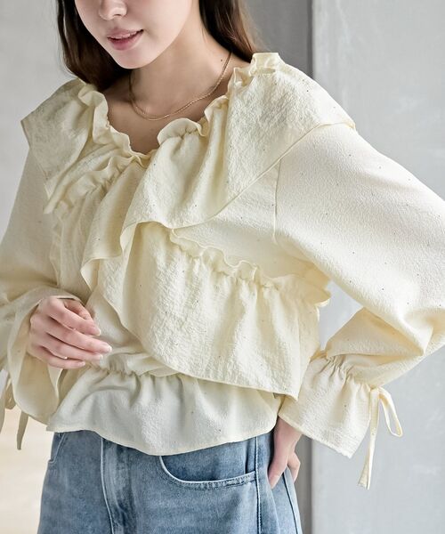 ☆2026/SS NEW☆たっぷりフリルの大人ガーリーブラウス肩から交差させたフリルがガーリーなムードのブラウス。きゅっと絞った袖口も手元に抜け感と愛らしさを演出します。リボンも添えて華やかさもプラス。ゴム仕様の衿ぐりは肩まで下げてオフショルとしてもご着用いただけます。小さなホットフィックスをちりばめて繊細なきらめきも添えたヒロイントップス。裏地なし伸縮性なし薄手襟・袖口・裾ゴム仕様袖口リボン取り外し不可ホットフィックス(ご着用やお洗濯を繰り返すとはがれおちる場合もございますこと予めご了承ください)洗濯:手洗い可▼お気に入り登録でお得がいっぱい▼~商品をお気に入り登録~再入荷・ラスト1点などの通知を受け取ることができます!~ブランドをお気に入り登録~《rps》の新商品・再入荷情報をいち早くお届け!