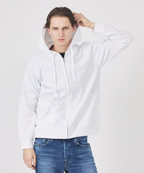 軽やかに羽織れるヘリンボーンパーカー 【素材】ヘリンボーンの立体感を際立たせたオリジナルのフクレジャガード生地を使用。 織り目が生む陰影が動きに応じて表情を変え、膨らみが空気を含むようなふっくら感を演出します。 程よいストレッチが効いて、窮屈さを感じさせない着心地です。 【デザイン】 軽やかな羽織り感とイージーケア性を兼ね備えたミニマルなデザインのジップパーカー。 室内での温度調整にちょうど良く、ルームウェアとしてもワンマイルのお出かけにも使える汎用性の高さが特徴です。 余計な装飾を省いたシンプルな美しさで、オールシーズン着用出来ます。 【コーディネート】 カジュアルなパンツから細身のきれいめスラックスまで、幅広いパンツと好相性。 インナーはTシャツからシャツまで自在にレイヤードでき、リラックス感ときちんと感を同時に叶える一着。 同素材長袖Tシャツ品番:71529720000 同素材半袖Tシャツ品番:71529721000 ********************** 透け感:なし 裏地:なし 伸縮性:あり 光沢感:ややあり 生地の厚さ:普通 クリーニング方法:手洗い可 **********************