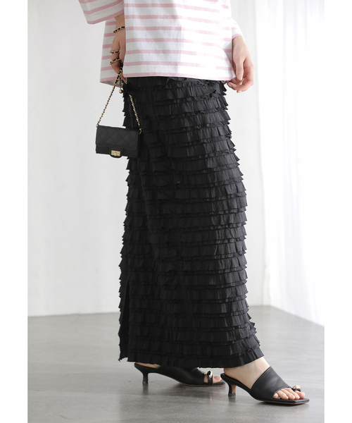 先方品番:PV-040040※サイズについて弊社販売サイズ:メーカーサイズフリー:F※カラーについて弊社販売カラー:メーカーカラーブラック(001):BLACKホワイト(010):OFF WHITE【2026SS】LaTotaliteフリル使いがフェミニンな印象のロングスカート。ウエストはゴム仕様なのでリラクシーな履き心地も魅力です。【PROVOKE(プロヴォーク)】provoke="挑発する" "引き起こす" "刺激する"服は着る人がどう着るか決めればいいという理念のもと、ジェンダーレス、タイムレス、エイジレス、色々な垣根や決めつけを無くし、自由な発想でスタイリングを提案します。**********************透け感:なし裏地:あり伸縮性:あり光沢感:なし生地の厚さ:普通**********************【スタッフ着用コメント】《スタッフ名:mizuki》身長:160cm/体型:普通/普段サイズ:S~M/着用サイズ:フリーサイズ感:ウエストはゴム仕様でジャストサイズ。フラットシューズを履いて裾が地面につかないぎりぎりの丈。素材感:肌あたりなめらかで伸縮性のある素材。着心地:スリット入りなので足さばきも良く、ストレスフリーな着心地でした。**********************※取り扱いについては、商品についている品質表示でご確認ください。※照明の関係により、実際よりも色味が違って見える場合があります。またパソコン・スマートフォンなどの環境により、若干製品と画像のカラーが異なる場合もございます。※商品の色味は、商品アップ画像をご参照ください。着用モデル身長:162cm 164cm 着用サイズ:フリー本体:手洗い可能