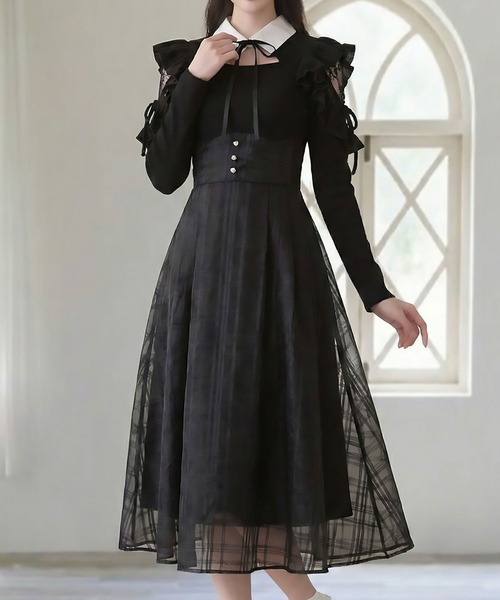 異素材MIXが目を惹く、フェミニンガーリーなドッキングワンピースのご紹介。 【デザイン】 クラシカルなカットソートップスと、シアーチェックスカートをドッキングさせた主役級ワンピース。 肩部分はレースをあしらった「肩あきデザイン」&フリル仕様で、程よい肌見せが叶い、あざとかわいさを演出◎ ウエスト部分はコルセット風の花弁切替デザインになっており、パール調のボタンがアクセントに。 ハイウエスト位置でマークされているので、着るだけで自然と脚長効果&スタイルアップが期待できます! スカート部分は、ふんわりとしたシアーチェック柄生地を重ねたエアリーなデザイン。 動くたびに軽やかに揺れ、重たくならず華やかなシルエットを作ります。 左脇にあるファスナーを開けて、襟元はボタンで開閉する仕様になっているので、被りで簡単に着用いただけます。 【素材】 トップス部分は、伸縮性のあるカットソー生地でさらっとした肌触りの良い素材感。 スカート部分は透け感のあるシアー素材と、裏地が2枚重ねになっています。 ※ブルーグレーは淡い色味の為、透ける可能性があります。 淡色インナーのご着用をお勧めします。 【コーディネート】 これ1枚でコーディネートが完成するので、迷った日のお助けアイテムとしても優秀です。 足元は厚底ローファーやパンプスを合わせたり ショートブーツを合わせたり等マルチに合わせていただけます。 デートや女子会はもちろん、推し活・参戦服、アフタヌーンティーなど 写真映えしたい特別な日の装いにぴったりな1枚です♪ 透けが気になる方は こちらのペチパン【534394/534372】を履くとより安心です。 ペチパンは大きいサイズのご用意も◎ ※ご覧のモニター環境や撮影環境により実際の商品と多少色味が異なって見える場合がございます。 ご理解の程よろしくお願いいたします。 【お買い物をよりお楽しみいただく為に】 ▼商品のお気に入り登録をおすすめします ♡をクリックしてください。 完売カラーの再入荷や、ラスト1点の通知、 セールの際の通知を受ける事ができます。 ブランドのお気に入り登録もご一緒にお願い致します。