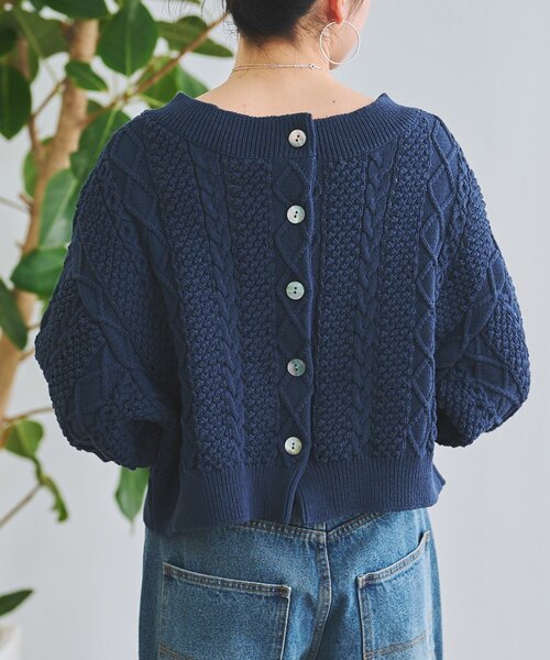 ■アイテム立体感のあるケーブル編みが目を惹く、表情豊かなニットプルオーバー。綿・ポリエステル素材を使用し、さらっとした肌触りでロングシーズン快適に着用いただけます。深すぎず横に広がりのあるVネックがデコルテをすっきりときれいに見せてくれます。ドロップショルダーのゆとりあるシルエットが、程よいリラックス感をプラスします。七分袖のバランスの良い丈感で、軽やかな印象。前後どちらでも着用できる2WAY仕様で、後ろ側はボタンデザインの丸襟がアクセントに。気分やスタイリングに合わせて、異なる表情を楽しめる一枚です。■素材・洗濯表示素材:綿52% ポリエステル48%洗濯表示:手洗い可※着用時・洗濯時は、必ず取扱い表示・タグをご確認の上、お取り扱い下さい。----------------------------------伸縮性:あり光沢:なし厚み:あつい透け感:なし----------------------------------《お取り扱い上のご注意》・タンブル乾燥不可《予約商品について》・サンプルの為、素材情報、洗濯表示については企画段階の情報を記載しております。公的機関での試験データ結果を受け、量産にあたり混率や洗濯方法の変更が発生する場合がございますので、ご了承くださいませ。・サンプルでの撮影、計測をしております。商品の仕様が一部変更になる場合がございます。・撮影サンプル品はブランドタグがついておりません。製品にはタグがつきますので、製品の表に縫い糸が見える場合がございます。・工場の生産の都合上、納期が変更になる場合がございます。検品や輸送の関係で、発送日が前後しますのでご了承ください。また、入荷状況により、お客様への発送が店頭販売より遅れる場合もございます。・店頭に陳列していた商品も含まれる場合がございます。《商品画像について》ご覧頂いている商品の写真につきましては、できるだけ実物の色に近くなるように努めておりますが お使いの環境(モニター、ブラウザ等)の違いにより、色の見え方が実物と若干異なる場合がございます。 予めご了承ください。《ハートをタップして商品のお気に入り登録》【ハートをタップ】登録カラーの商品の「残りわずか」「再入荷」「値下げ」通知を受け取ることができます。【各ショップアプリにてブランドフォロー】 新商品などの入荷情報、最新のニュースやお得な情報を受け取ることができます。