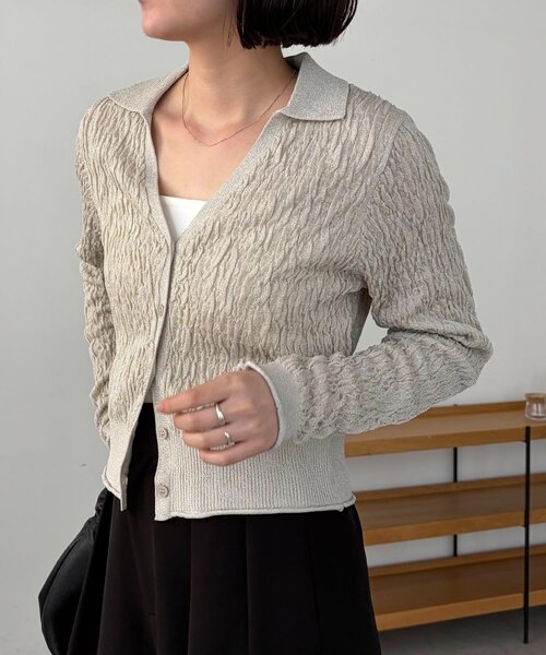 波打ったシャーリング生地が他にないカーディガン 商品ポイント ・さりげないラメ混のニット ・Vネックの襟付きニットで襟が苦手な方も取り入れやすい ・コンパクトなサイズ感でロングスカートやワイドパンツにもバランスよく着られる1枚 ・裾と袖口がロール始末になっており抜け感をプラス ・裾を開けて抜け感を出して着るのがおすすめ スタイリングポイント ・ワイドパンツ合わせのメリハリのあるスタイリングに ・デニムやスウェットパンツでカジュアルに着るのもおすすめ 【ライトベージュ着用アイテム】2タックワイドパンツ 【ブラック着用アイテム】スリットポケットストレートデニム ********************** 透け感:なし 裏地:なし 伸縮性:あり 光沢感:なし ********************** ▼洗濯方法 手洗い可能 ※撮影場所やお使いのモニター環境により若干お色味が異なる場合がございます。 特にロケの撮影では明るく見える傾向にございます。 ※商品はサンプルで撮影をしております。若干の仕様が変更になる場合がございますので予めご了承の上ご注文くださいますようお願いいたします。 ▼商品のお気に入り登録 完売カラーの再入荷通知や、ラスト1点の通知、セールの通知も受け取ることができます。