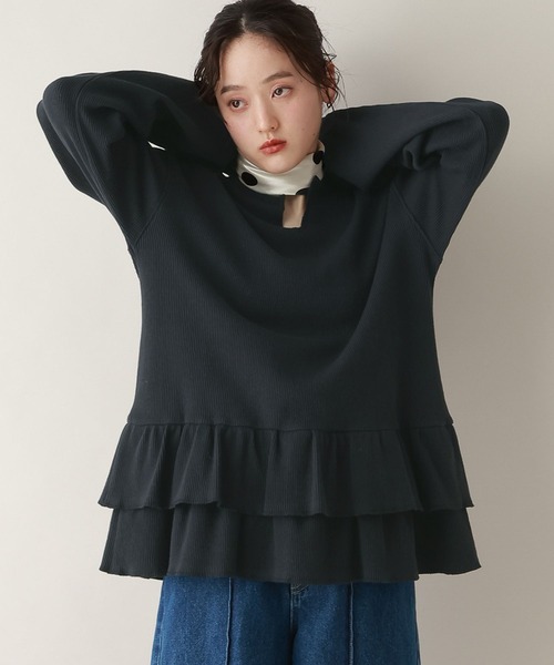 ペプラムデザインが目を惹く一着。■おすすめの着こなし☆パンツスタイルには・・・ボリュームのあるフリルが特徴的なアイテムなので、ハーフパンツやショートパンツですっきりまとめるのが◎足元はローファーやブーツなどのきれいめと合わせることで、大人見えが叶います。☆スカートスタイルには・・・Iラインスカートなどのタイトなアイテムと合わせることで、クリーンなスタイルに。ジャケットやコートなどのきれいめアイテムを合わせれば、落ち着いた印象で着用可能です。ーーー■ポイント前後2WAYで着れる、カジュアルな一着。キーネック&クルーネックデザインなので、どちらを前にして着ても◎ウエストからフリルが段々になっているペプラムデザインなので、女性らしい印象で着用いただけます。着心地抜群のワッフル生地を使用しているので、ルームウェアとしてもおすすめです。程よくゆとりのあるサイズ感なので、腰回りや二の腕回りの体型カバー可能なのも嬉しいポイント。カジュアルからきれいめまで幅広くお楽しみいただける一着です。■素材柔らかく、肌触りのよいワッフル生地を使用。