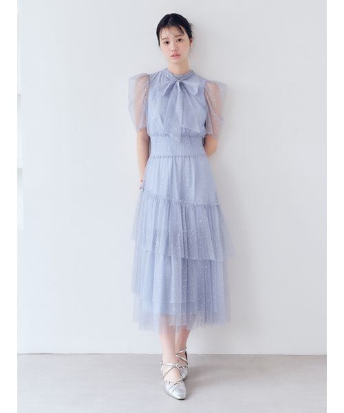 全体に散りばめられたラメが輝きを放ち、ロマンティックムードを盛り上げるドレス。ウエストシャーリングでメリハリのあるシルエットに。前後どちらでも結べるボウタイが華やぎを添えるポイントとなっております。結婚式やオケージョンシーンにもおすすめのアイテムです。 透け感;あり 裏地;あり 伸縮性;なし 光沢感;あり 生地の厚さ;薄手 ■お選びいただく前に、気になるポイントにお答えします■ Q1. どんなシーンにおすすめですか? A.きらめくラメチュールが華やかな印象を演出してくれるため、パーティーやオケージョンシーンにはもちろん、特別なお出かけの日にもおすすめの一着です。 Q2. 二の腕はカバーできますか? A.ぽわっと広がったハーフスリーブデザインなので、気になる二の腕まわりをさりげなくカバーしながら、軽やかな印象で着用いただけます。 Q3.透け感はありますか? A.チュール素材ならではの軽やかな透け感があります。 胸周りやスカート部分に透け感はないので、安心して着用いただけるデザインです。 Q4. 動くとどんな印象になりますか? A. 全体にラメを施したチュール素材が動くたびにさりげなくきらめき、華やかな雰囲気を演出します。 Q5.季節を問わず着られますか? A.一枚ではもちろん、ジャケットやカーディガンを羽織ることでロングシーズン着用いただけます。 Q6.ボウタイは甘すぎて挑戦しづらい… A.ボウタイは後ろに回すこともできるので、フロントだと甘すぎる…という方はバックにボウタイを持ってくるのがおすすめです。さりげなくロマンティックを取り入れて大人可愛いスタイルに仕上がります。