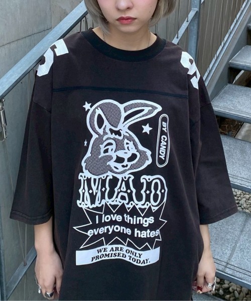コミックタッチなうさぎとロゴのグラフィックが目を惹くフットボールT。 ユニフォーム風な肩のナンバリングもポイント。 ヴィンテージな風合いを出すためにウォッシュ加工をかけています。 ゆったりしたルーズな袖丈とビッグシルエットなサイジングで、ストリートなスタイリングがおすすめ◎ ・・・・・・・・・・・・・・・・・・・・・・ ・透け感:なし ・伸縮性:あり ・生地の厚さ:普通 ・裏地:なし ・・・・・・・・・・・・・・・・・・・・・・ ・オフホワイト/白、レッド/赤、ブラック/黒の3色展開 #カジュアル#ストリート#うさぎ#サッカー#ナンバリング#フットボール#オーバーサイズ#キャンスト#キャンスパ#CND ●Candy Stripper/キャンディストリッパー● -BRAND CONCEPT- NO RULE, NO GENRE, NO AGE 年齢や性別にとらわれず、自由に自分を表現出来る服 【お買い物をもっとお楽しみ頂くために】 ▼商品のお気に入り登録▼完売カラーの再入荷通知や、ラスト1点通知、 プライスダウンしたセール通知も受け取れる♪ ▼ブランドのお気に入り登録▼ 新作や再入荷等、いち早くブランドのお得な情報が受け取れる♪