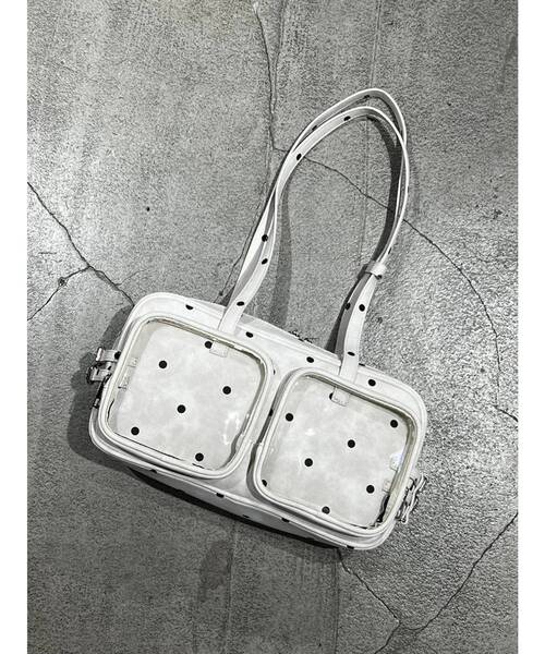 クリアのダブルアウトポケットがポイントのショルダーバッグ■デザイン春夏らしい雰囲気と、自身のお気に入り小物を魅せるデザインがポイントです。マチ幅がしっかりとある長方形のボディで荷物の出し入れもしやすく使い勝手が良いです。ショルダーは長めのデザインで肩にも掛けやすい設定にしています。ブラック・ブラウン→ヴィンテージ風の合皮です。ホワイトT→ドット柄のヌバック風合皮です。※着用画像はフラッシュの加減で実際の製品と色味等が異なる場合がございますので、生地のズームアップ画像をご確認ください。※ご利用の端末画面の設定により実際の商品と色味が異なる場合がございます。