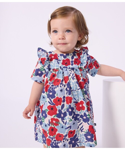 鮮やかなフラワープリントをあしらった半袖ワンピース&ブルマセットです。肩口のフリルや、シルエットに変化をプラスする切り替えがデザインのアクセントに。背面が大きく開くので、外出時のお着替えも安心。愛らしいデザインのアイテムは、ご自宅用としてはもちろん出産祝いなどのギフトにも喜ばれます。※1.プリントは永久的なものではなく、もみや摩擦でひび割れたり、繰り返しの洗濯によるプリントの変色や、脱落が生じる場合があります。中性洗剤などで単独洗いをしてください。