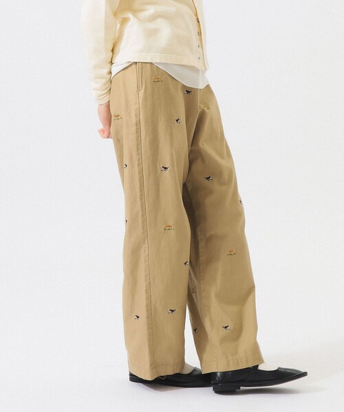 愛嬌たっぷりの相棒チノパンツ■デザイントラディショナルなカレッジスタイルの定番であるエンブロイダリー(刺繍)入りのチノパンツを、今の気分にアップデートして製作。クラシックな背景を大切にしつつ、遊び心とリラックス感をプラスしました。今回はあえてポップで愛嬌のある「ゴールデンレトリバー」と「ビーグル」をモチーフに採用。クラシックなネタを現代的なバランスで「可愛げ」のあるルックスへと昇華させています。■コーディネートスウェットやフーディーと合わせたカジュアルな着こなしや、あえてレースブラウスなど甘めのトップスと合わせたミックススタイルもおすすめ。足元はローファーでトラッドに締めても良し、スニーカーで軽快に外してもサマになります。■サイズ太めのボディを採用し、程よいリラックス感を持たせました。体型を拾いすぎず、こなれた雰囲気を演出します。■素材程よい厚みとハリ感を持つコットン100%の20番手ツイル生地を使用。チノ素材らしいしっかりとしたコシがありながら、着用を重ねるごとに肌に馴染み、柔らかく変化していく過程も楽しめます。■ケア方法手洗い可(詳細は商品についている品質表示ラベルをご覧ください)Model : H164 B72 W59 H85 Size : 1※アイテムサイズは商品サンプルを採寸しているため、実際の商品と多少の誤差が生じる場合がございます。※画像の商品はサンプルのため、実際の商品と「仕様」「色合い」が異なる場合がございます。※予約販売の商品は、一部店舗で在庫がある場合がございます。