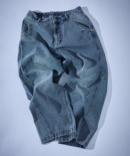 穿くだけで様になる。注目のデニム丸みのあるカーブシルエットをベースにしたリラックスフィット。重ねた加工による独特な色感がヴィンテージ感を演出。3カ所に入るダーツがコーディネートのアクセントに。Tシャツ1枚で合わせても、見劣りしない主張のある一本です。【デザイン】オールシーズン穿きやすい10オンスデニムを採用。脇線が斜めに走る立体裁断パターンが特徴のデニムパンツです。トレンドのカーブシルエットをベースに裾幅を広げリラックスしたサイズ感に。随所に入った色の落ち感がヴィンテージライクな印象を作ります。ポケット口・膝脇・後裾、3カ所にダーツを入れ、どの方向から見てもデザイン性が光ります。腰ポケットは5ポケット型をベースに斜め取りすることで、アクセスしやすい間口。リベットが付属し無骨な印象を作ります。ウエスト後ろはバックゴム使用。フィット感とサイズカバー率を向上させています。【加工】ブルー…インディゴデニムにウォッシュ加工をかけ、グリーンカラーでオーバーダイ加工を施しました。爽やかながら深みのあるブルーに仕上がっています。合わせやすく、きれい目スタイルの外しとしてもマッチします。ベージュ…ブラックデニムにウォッシュ加工をかけ、ベージュカラーでオーバーダイ加工を施しました。随所にグレーの色感が覗き、独特の色感。チノパンのように使えながら、一味違う印象を作れます。グレー…ブラックデニムからアイスグレーへとウォッシュ加工をかけました。重たくなりすぎないグレートーンで、爽やかな色目とも相性の良いカラーリングです。※加工を施した商品のため、全体的な色の出方に1点1点個体差があります。※撮影画像は、光の当たり具合で色味が多少異なって見える場合があります。商品の色味は素材詳細画像をご参照ください。