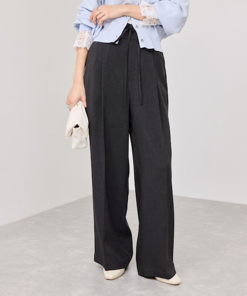 【2026 Spring】【26SS】 <POINT> ・快適に過ごせるようなドライでサラッとした履き心地のサマーツイード生地を使用 ・ワンタック入りの定番スラックスシルエット ・後ろ中心のみゴム入りですっきりとリラックス感を叶えました ・UVケア機能付き、お手入れの簡単なマシンウォッシャブル素材 【デザイン・シルエット】 タックでヒップ周りに余裕の出るラクチンな履き心地にも関わらず、ストーンと落ちるシルエットですっきり着ていただけます。 細目の共紐がついているので、細目のリボンにしたり垂らしたりとポイントにできます。 【素材】 薄手で軽やかなサマーツイード素材。 UVケア機能、お手入れの簡単なイージーケア素材。洗濯機洗い可能。 【カラー】 チャコール、グレー、ベージュ系の3色展開。 【おすすめのスタイリング】 Tシャツですっきりとカジュアルに着ていただくのもおすすめ。 すっきりシルエットなのでジャケットやシャツとも相性いいです。 ----------------------------- 裏地:なし 光沢感:なし 透け感:なし 伸縮性:ややあり ウエスト:後ろ一部ゴム ファスナー:前にあり ポケット:あり ボタン:なし 生地の厚さ:普通 その他仕様:紐ベルト付き 季節:春、秋 ----------------------------- 【モデル着用サイズ】 モデル身長:160cm 着用サイズ:M ※画像の商品はサンプルです。 実際の商品と仕様、加工、サイズが若干異なる場合がございます。 ※画像によっては実際の色味と異なる場合があります。正しい色味は生地アップ画像をご確認ください。