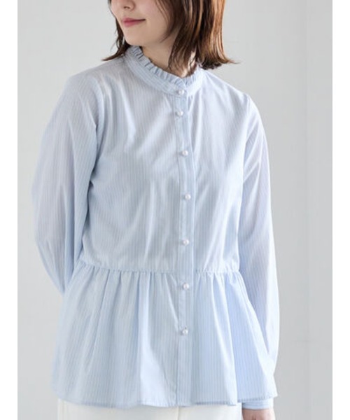 スタンドフリルとパール調ボタンが、顔まわりを上品に彩るブラウス。切り替えデザインのペプラムシルエットがふんわりとした立体感を演出し、着るだけでバランスの良いスタイリングが完成します。ウエストまわりをさりげなくカバーしてくれるAラインシルエットも嬉しいポイント。パール釦でアクセントを付ける事で上品さをプラスしています。デニムと合わせて程よくカジュアルに、スラックスやタイトスカートと合わせればきれいめな着こなしにも対応でき、オン・オフ問わず活躍します。春らしいマルチストライプのカラー展開で、コーディネートに季節感をプラスしてくれる一枚です。※商品画像は、撮影環境やお客様のご利用のPC・スマートフォンのモニター環境などにより実物と色味に差異がある場合がございます。※着用画像はサンプルを使用して撮影しております。製品と一部仕様が異なる場合がございます。予めご了承ください。