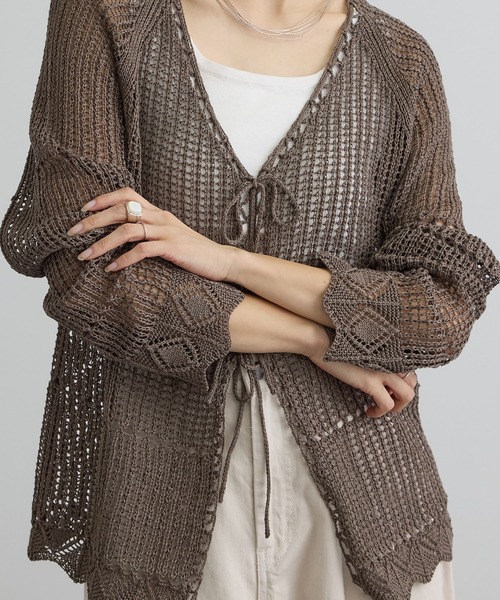 トップス感覚でも羽織りとしても着回しが楽しめるVネックカーディガン。程よいタイトフィットとクロシェ編みの表情がスタイリングに抜け感をプラスする1枚 ■デザイン/シルエット 程よいタイトフィットのVネックシルエットが女性らしい印象を演出。 クラフト感のあるクロシェ編みで、1枚でも存在感のあるデザインです。 フロントはリボン仕様で、結んでフェミニンにも、外してラフにも着用可能。 長袖ながらドライタッチで、暑い時期からシーズンを通して活躍します。 ■素材 コットン100%の糸にコーティング加工を施し、麻のような清涼感を表現。 さらっとした肌触りで肌離れが良く、型崩れしにくいのもポイント。 手洗い可能なイージーケア素材です。 ■コーディネート ハーフパンツ合わせで軽やかに抜け感のあるスタイリングや、 リラクシーなパンツと合わせた大人のカジュアルスタイルがおすすめ。 リボンを外してラフに羽織れば、こなれた雰囲気に仕上がります。 ■モデル身長:166cm 着用サイズ:F ----------------------------- 裏地:なし 光沢感:なし 透け感:あり ポケット:なし 伸縮性:あり 生地の厚さ:薄手 ----------------------------- ※画像の商品は光の照射や角度、お使いのモニター環境(パソコン・スマートフォン)により、色味が違って見える場合があります。 ※商品の色味は、商品アップ画像をご参照ください。