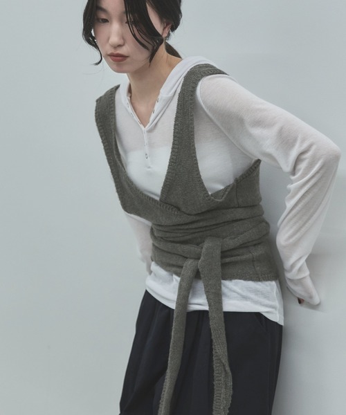 ◆Detail スタイリングのワンポイントアイテムとして汎用性の高いデザインビスチェ。 一見難しそうに見える着衣方法ですが、フロントでクロスさせウエスト周りに紐部分を巻き付けるだけでお洒落上級者の着こなしに早変わり。 インナーにはロンTやTシャツ、シャツなどとの合わせがおすすめ◎。 またシンプルなロングワンピースとのレイヤードなどもこなれ感が出ておすすめです。 薄手で軽さのある糸を使用しているためシーズンレスで着回しが楽しめます。 ◆Fabric ———————————- 透け感:ややあり 伸縮性:あり 光沢:なし 生地の厚さ:★★★☆☆ ———————————- ※汗や水、摩擦により他のものに色移りすることがありますのでご注意ください。濃色製品は色移りすることがありますので、他の物と分けて洗濯してください。 ※生産時期によりサイズや質感・色味に若干の個体差がみられる場合がございます。 ※商品画像は、光の当たり具合やパソコンなどの閲覧環境により、実際の色味と異なって見える場合がございます。 予めご了承ください。 ※着用、お取り扱いの際は、商品についている品質表示とアテンションタグを必ずご確認ください。 ◆Information 欲しいitemをお気に入り登録(♡マークをclick) ・お買いのがし対策…完売itemの再入荷やラスト1点の情報をお知らせ ・欲しいitemをお得にget…pricedownになったらいち早くお知らせ ・スムーズ検索…ZOZOのお気に入りアイテムページで簡単checkできるから、再検索不要♪