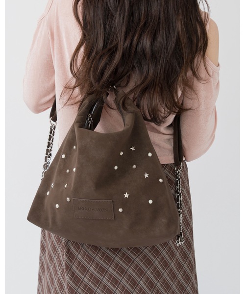 星やパール等のスタッズを散りばめたときめきを連れてくれるバッグ。 気分やコーデに合わせて持ち方を変えられる大容量の3way仕様。 ・ナップサック ・肩掛けバッグ ・斜め掛けバッグ アレンジは持ち手の長さを調節しさっと簡単に行えます◎ スウェード見えする合皮生地が上品かつ扱いやすく、起毛感のない素材のため、シーズン問わず使用可能です。 様々なデザインの小さいスタッズが、ハード過ぎずともトレンド感を取り入れたmellowneonらしいアイテム。 共生地のロゴパッチがさりげないアクセントに。 ・内ポケット付き ・スマホがすっぽり入る外ポケット付き コーデの仕上げにそっと寄り添う主役バッグです。 着用の商品写真は、サンプルでの撮影のため、色味や加工の見え方に若干の違いがある場合がございます。予めご了承ください。 また、お使いの端末やモニターによってもお届けの商品と多少の差が生じる可能性がございます。