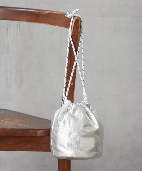 いつものスタイルに、さり気なく個性をプラス ブランドで人気のメタリックの生地を使用したミニ巾着バッグ。 光の加減で表情を変えるコーデの主役にも引き立て役にも◎ パラコードの紐がアクセントになり、シンプルながら存在感があります。 小さめのサイズなので、ポーチとしてはもちろん、ちょっとそこまでのお出かけにもぴったりです。