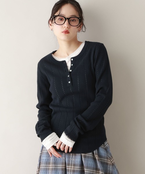 一枚でサマになる、トレンドニット◎■おすすめの着こなし☆レイヤードスタイルに・・・コンパクトなインナーを合わせて、首回りのレイヤードスタイルを楽しむのもおすすめ。ボタンを少し開ければ、すっきりとした印象になります。☆アウターなどのインナーにもおすすめコンパクトでかさばらないデザインなので、ジャケットなどのインナーとしてもおすすめ。程よくストレッチが効いているので、疲れにくく、ストレスフリーで着用いただけます。ーーー■ポイント一枚でも、インナーでも大活躍な一着。アイレット編みデザインなので、無地ながらも柄見えするアイテムに。身体のラインに沿うシルエット×縦のラインが出るので、スタイルアップ効果も◎トレンドのヘンリーネックデザインなので、着るだけでこなれ感溢れる着こなしに。裾がラウンドしているデザインなので、一枚で着ても映える一着に仕上がりました。ニットやスウェットなどのインナーとして着るのもおすすめです。■素材薄手で柔らかく、肌触りの良いコットンとモダール素材を使用。着心地にもこだわった一着です。