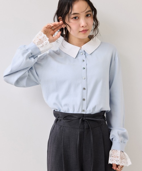 【2026 Spring】【26SS】 <POINT> ・長めの袖のレースが今年らしいデザインポイント ・ハーゲージの薄手スプリングニットでオンオフで使えるデザインです。 ・首回りに抜け感が出るよう襟を大きめにしすっきりするようにしました。 【デザイン・シルエット】 1枚でスタイリングが完成させるシャツ襟とレース袖がドッキングされているニットトップス。 存在感のある長めの袖レースがコーディネートのアクセントに。ジャケットを羽織って袖からレースを出したりしスタイリングの変化を楽しんで頂きたいです。 【素材】 手洗い可能。 ハイゲージの程よく綺麗めニット素材です。薄手なので、これからの時期着やすい素材です。 オンオフでも着れるので通勤/オフィスカジュアルにも◎ 【カラー】 アイボリー、ブルー、ブラウンの3色展開。 襟、袖部分はすべて白になります。 【おすすめのスタイリング】 1枚でスタイリングが完成されるトップス。 ----------------------------- 裏地:なし 光沢感:なし 透け感:ややあり 伸縮性:あり ボタン:あり(開閉可) 生地の厚さ:普通 その他仕様:襟のシャツ、袖のレースそれぞれドッキング仕様 季節:春、秋 ----------------------------- 【モデル着用サイズ】 モデル身長:160cm 着用サイズ:F ※画像の商品はサンプルです。 実際の商品と仕様、加工、サイズが若干異なる場合がございます。 ※画像によっては実際の色味と異なる場合があります。正しい色味は生地アップ画像をご確認ください。