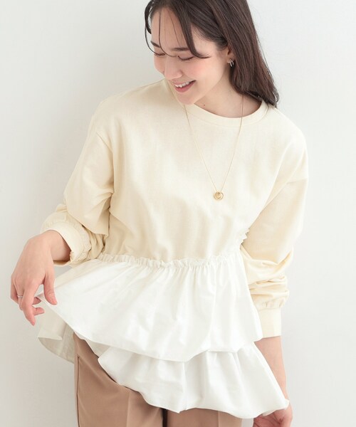 【デザイン】 ベーシックな薄手のスウェットに、サイドからシャツ地のティアードフリルを施したトップス。 上品な甘さを添えるアシンメトリーデザインがポイントです。 ゆったりとしたシルエットながらも、お袖口の仕様で女性らしいラインを保ちます。 少しふんわりとしたお袖がカジュアルながらも女性らしい印象に仕上げています。 【スタイリング】 デニムやワイドパンツと合わせてカジュアルな休日スタイルに。 一枚でこなれた印象を与えることができ、個性を主張できる、ワードローブの強い味方になるアイテムです。 細身のパンツやナロースカートと合わせれば、オフィスカジュアルにもマッチ。 ゴールドの小ぶりなアクセサリーを添えれば、さらに上品な印象に。 【素材】 本体はソフトな肌触りの綿混素材を使用し、長時間着用しても心地良いです。 重すぎない裏毛スウェット素材で長い期間で着られるのもうれしいポイント。 フリル部分は軽やかなコットン混のシャツ素材。 オールシーズン活躍する素材感で、一年を通して様々なスタイリングに取り入れやすいアイテムです。 ※照明の関係により、実際よりも色味が違って見える場合があります。また、パソコン・スマートフォンなどの環境により、若干製品と画像のカラーが異なる場合もございます。 モデル情報:身長163cm B81 W59 H88 着用サイズ:02(M) 店舗へのお問い合わせ商品番号:C62-15622 ●製品寸法: 02(M):着丈61cm B102cm 袖丈55cm 肩幅51cm 03(L):着丈62cm B110cm 袖丈55cm 肩幅52cm 備考: