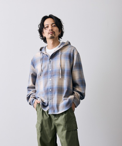 トレンドのストリートスタイルにハマる、フード付きチェックシャツ。●程よい厚みの生地で、Tシャツやタンクトップの上に羽織るのに最適なコットン混生地●身幅と肩幅にゆとりを持たせたオーバーサイズ/ビッグシルエット●カジュアルなフードが付いており、パーカー感覚でラフに着こなす一枚●コーディネートの幅が広がる、多彩なチェック柄をご用意TシャツやロンT、サーマル(ワッフル)の上にラフに羽織り、前を開けてインナーを見せる着こなしがおすすめ。ネックレスやチョーカーなどのアクセサリーも映えます。男女問わず、ユニセックスで着用可能です。