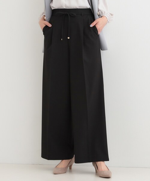 【デザイン】柔らかでさらりとした素材が特徴的なワイドパンツです。イージーパンツながら、ウエストのリボンディティールとセンタープレスがきちんと見えするデザイン。ウエストゴム仕様で、楽にキレイに穿いていただける太すぎないワイドシルエットです。レギュラー丈・ショート丈の2丈から選べます。【スタイリング】ハイゲージのニットやきれいめブラウスに合わせていただくと、オフィスカジュアルにピッタリ。ロンTやTシャツと合わせれば、こなれたカジュアルスタイルになりおすすめです。【素材】柔らかくサラッとした素材感。【仕様】・ポケット数:横×2・ウエスト後ろゴム・裏地なし※ベージュ(052)、ブルー(291)はやや透け感があるため、インナーの着用をおすすめします。※照明の関係により、実際よりも色味が違って見える場合があります。また、パソコン・スマートフォンなどの環境により、若干製品と画像のカラーが異なる場合もございます。モデル情報:身長163cm B81 W59 H88 着用サイズ:02(M)店舗へのお問い合わせ商品番号:C62-65306●製品寸法:01(S):W66~70cm H90cm 股下67cm 前股上32cm 渡り幅29cm 裾幅29cm 付属ひも全長142cm 幅1cm02(M):W68~72cm H92cm 股下68cm 前股上33cm 渡り幅30cm 裾幅30cm 付属ひも全長145cm 幅1cm03(L):W71~75cm H94cm 股下69cm 前股上33cm 渡り幅31cm 裾幅30cm 付属ひも全長148cm 幅1cm04(LL):W74~78cm H96cm 股下70cm 前股上34cm 渡り幅33cm 裾幅31cm 付属ひも全長151cm 幅1cm36(Sショート丈):W66~70cm H92cm 股下57cm 前股上32cm 渡り幅30cm 裾幅29cm 付属ひも全長143cm 幅1cm38(Mショート丈):W68~72cm H93cm 股下58cm 前股上32cm 渡り幅31cm 裾幅30cm 付属ひも全長145cm 幅1cm40(Lショート丈):W71~75cm H93cm 股下59cm 前股上33cm 渡り幅32cm 裾幅31cm 付属ひも全長148cm 幅1cm42(LLショート丈):W74~78cm H94cm 股下60cm 前股上33cm 渡り幅33cm 裾幅32cm 付属ひも全長151cm 幅1cm備考: