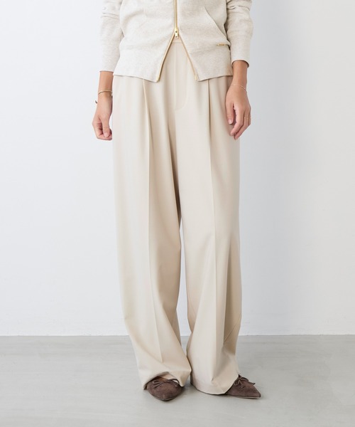 ややコクーンシルエットラインのワンタックパンツです。ウエストゴムで楽ちんに着用でき、お腹が膨れて見えないようにウエストフロント部分はすっきりとしたデザインにしています。同素材のジャケットと合わせたセットアップスタイルでは、オケージョンにも対応可能。腰回りにゆとりを持たせつつ、きれいめなシルエットを演出できるため、デイリーからきれいめまで幅広く着回せるアイテムです。【fabric】毛羽も少なく、しなやかでドライタッチでウールのような上質感が特徴のトロピカル素材。2wayストレッチなので履き心地の良い素材です。--------------------------------------透け感:なし裏地:あり伸縮性:あり光沢感:なし生地の厚さ:普通ポケット:あり--------------------------------------水洗い可*詳しくは商品の洗濯表示にてご確認をお願い致します。【coordinate】きれいめなブラウスやシャツ、薄手のニットなどが好相性。パンツの立体感を活かすため、トップスはタックインしてウエスト周りをすっきりと見せるのがおすすめです。ジャケットを羽織ることで、よりきちんと感がアップします。パンプスやローファーなど、足元もきれいめなアイテムでまとめると、全体のバランスが整います。また、Tシャツやスウェット、パーカーなどを合わせると、こなれ感のある大人カジュアルな雰囲気を演出できます。■おすすめシーン卒園式 卒業式 入園式 入学式 学校行事 参観 七五三 お宮参り 同窓会 謝恩会 結婚式 ハレの日【staff comment】《スタッフ:157cm》着用サイズ:36/普段サイズ:36/S~M普段着用サイズでちょうど良く履けました。丈はやや長めのデザインでゆったりと履ける今年らしいシルエットです。《スタッフ:168cm》着用サイズ:38/普段サイズ:38/M~Lウエストは36サイズでも良かったのですが、丈の長さが欲しかったので38サイズにしました。ウエストは後ろにゴムが入っていて履きやすく、ベルトループ付なので、ベルトで調節できるのも嬉しいです。こちらの商品はセットアップとしてもお楽しみいただけます。ドライタッチダブルジャケット/0126105019※商品画像はできる限り実物の色に近づけるよう徹底しておりますが、お使いのデバイスのモニター設定、お部屋の照明等の閲覧環境により実際の色味と異なって見える場合がございます。※画像の商品はサンプルです。実際の商品と仕様、加工が若干異なる場合があります。予めご了承くださいませ。▼商品のお気に入り登録お気に入りアイテムの値下げ・再入荷・在庫1点などの通知を受け取ることができます。 ▼ブランドのお気に入り登録新商品や再入荷、クーポン配布などのお得な情報を受け取ることができます。