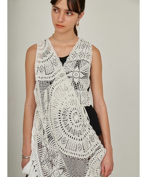 ーーーーーーーーーーーーーーーーーーーーー ディレクターのこだわりが詰まった 特別なハイエンドライン 「styling/ by kei shirahata」 ーーーーーーーーーーーーーーーーーーーーー 【Design/Styling】 繊細なレースのようなかぎ針編みのニットベスト。 紐を結び付けて右身頃をたゆませた、アシンメトリ―デザインで着用していただけます。 タッセル部分は膨らみのある糸を採用し、ボリューム感をプラスしました。 ハンドメイドならではの特別感のある表情が楽しめる一枚。 リネン混の表面変化のある糸で、ビスコースの微光沢もある高級感のある素材です。 透け感:あり 生地の厚さ:普通 裏地:なし 伸縮性:あり 前後着用可能(3WAY) ※照明の関係により、実際よりも色味が違って見える場合があります。 またパソコン・スマートフォンなどの環境により、若干製品と画像のカラーが異なる場合もございます。予めご了承ください。 商品の色味は、商品単品画像をご参照下さい。 ※商品画像はサンプルのため、色味やサイズ等の仕様に変更がある場合がございますので、予めご了承ください。