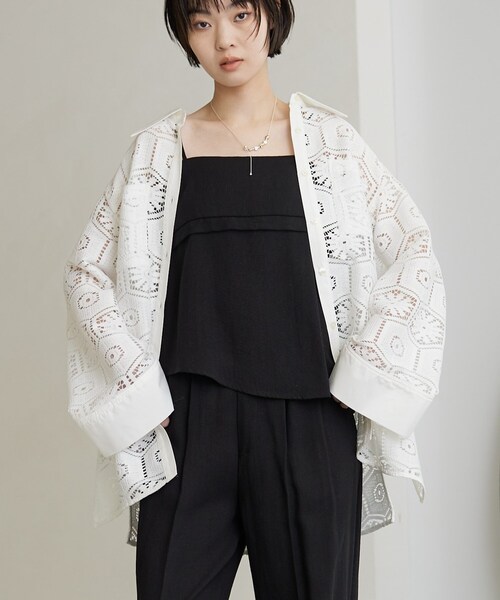 Design Point ダイナミックさと繊細さが目を惹くレースシャツは、上品な透け感が特徴。 幾何学模様やフレアラインの太めスリーブなど、シンプルながらも存在感がある仕上がり。 襟元の無地部分とレースの組み合わせが絶妙なバランスを生み出し、洗練された印象を与えます。 Styling Point タイトなボトムスやクラシックなスラックスと合わせることで、女性らしさを引き立てたスタイルに。 カジュアルなデニムにも合うため、普段使いにも最適です。 タンクトップやシアーなカットソーとのレイヤードなど、透け感を活かしたレイヤードが楽しめる一枚です。 Fabric Point 適度なハリ感があるレース素材を使用。 さらっとした着心地ながら、きちんとした印象を保ちます。 モデル身長:170cm ***************************** 気になるアイテムは【お気に入り登録】がおすすめ! 気になるアイテムのページにある「ハートマーク」をクリックして簡単に追加できます。 登録すると、再入荷通知やお値下げ情報をメルマガにてお知らせします。 マイページにてお気に入り一覧もチェックできます。 ***************************** ※照明の関係により、実際よりも色味が違って見える場合があります。また、パソコン・スマートフォンなどの環境により、若干製品と画像のカラーが異なる場合もございます。 店舗へのお問い合わせ商品番号:523-85017 ●製品寸法: 38(M):着丈72cm B110cm 袖丈56cm 肩幅46cm 備考:
