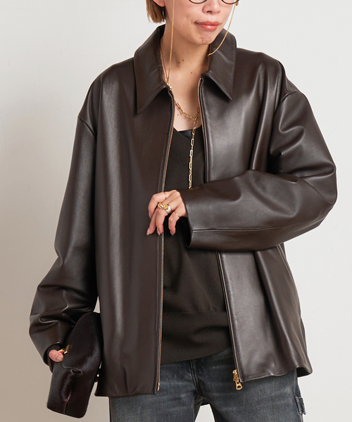 ミニマルに着れるレザージャケット。上質なラムレザーをスッキリ切り替えなく大きなパーツで取ることで、ミニマルでモダンな印象に仕上げました。ゆったりしたサイズ感に、ダブルジップ仕様でバランス良く着ていただけます。深いブラウンカラーがエレガントで今年気分のブラウンコーデが楽しめます。※取り扱いについては、商品についている取扱表示にてご確認下さい。※照明の関係により、実際よりも色味が違って見える場合があります。またパソコン・スマートフォンなどの環境により、若干製品と画像のカラーが異なる場合もございます。※商品の色味は、商品アップ画像をご参照ください。本体:洗濯不可