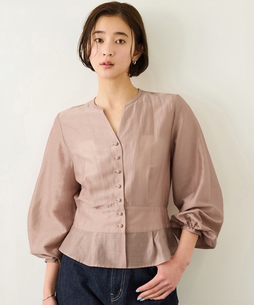 ウエストラインに美しさを。シャーリングが生むメリハリで、体型カバーも叶うフェミニンなデザインブラウス 【デザイン・シルエット】 後ろウエスト部分にシャーリングを施し、程よくウエストラインを引き締めたタック入りペプラムシルエットが女性らしさを引き立てるデザインブラウス。 ふんわりと広がるシルエットながらも甘くなりすぎず、体型カバー効果も期待できます。 素材特有の上品な光沢感と程よいシアー感が、抜け感のある大人フェミニンな印象を演出します。 【おすすめのスタイリング】 オン・オフ問わず活躍する、1枚でコーディネートが完成する主役ブラウス。 タイトスカートやフレアスカートと合わせればきれいめ・オフィススタイルに、 デニムパンツやワイドパンツと合わせれば程よくカジュアルダウンした着こなしも楽しめます。 シーズンを通して着回し力の高いアイテムです。 【素材】 シアーカールマイヤー素材を使用。 ソフトで軽やかな風合いと、繊細でなめらかなタッチが特徴です。肌離れが良く、快適な着心地を叶えます。 ---------------------------- 透け感:あり 裏地:なし 伸縮性:なし 光沢感:あり 生地の厚さ:薄手 ポケット:なし 開き方:ボタン 洗濯:手洗い可能 ---------------------------- 【モデル情報】 モデル身長:171cm 着用サイズ:38 ※画像の商品はサンプルです。実際の商品と仕様、加工、サイズが異なる場合がございます。 ※撮影場所やライティング、お使いのモニター環境によって色の見え方が異なる場合がございます。 ※商品のカラーは画像の色味をご参照ください。動画は仕様説明のため、色味が実物と異なる場合がございます。