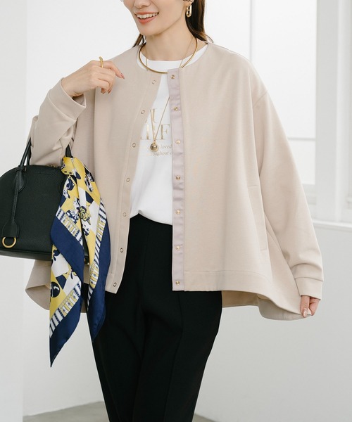 2026 SPRING&SUMMER NEWITEM ライトダンボールのフレアーヘムが軽やかなジャケットが登場! 〈デザインポイント〉 しなやかでスフレタッチな薄手ダンボール素材のジャケットは軽くて扱いやすい1枚。 前を開けたときに見えるグログランテープがポイント!GOLDの付属遣いでクラス感のある印象に◎ フレアな裾で程よいテントラインがトレンド顔にしてくれます。 ゆったりしたサイジングで体のラインを拾いません。 ほんのりAラインシルエットでおしりに被る着丈なのでボトムを選びません。 コートインにはもちろん◎春先の羽織としてもお使いいただけます。 〈生地・素材のポイント〉 大好評のしなやかでスフレタッチな薄手ダンボール素材を使用! 程よい厚みの綺麗目生地を使用しているのでカットソーよりも上品見えがうれしいポイント! 薄手ダンボール素材はボディラインを拾いにくく、オーバーシルエットで着用頂けます。 ・家庭洗濯可能 〈コーディネート・その他〉 寒い時期には薄手のタートルインでレンド意識をしたレイヤードスタイルに◎ 暖かい時期にはTシャツやシャツ、ロンTやタンクトップまで幅広く着回しが効きます! 前が短めの設定なのでワイドパンツやスカート合わせでも◎ 生地の厚み:薄手 伸縮性:アリ 透け感:ナシ 光沢感:ナシ 水洗い:可 総重量:430g