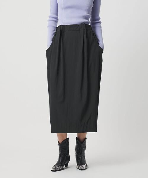 ポケットがアクセント。美しいコクーンシルエットのミディ丈スカート■デザインサイドの大きなポケットをポイントに、コクーンシルエットが魅力のミディ丈スカート。ウエストのダブルタックが全体の表情に変化を与えるアクセントとして効いています。モードな雰囲気と美しいシルエットを持ちながら、ウエスト後ろはゴム仕様で履きやすく、デイリーユースに嬉しいポイント。裾に向かって細くなるすっきりとデザインで、バックには足さばきを考慮したベント入りです。■素材程よく厚みのある高密度のレーヨンナイロン素材を使用。しなやかな風合いと落ち感があり、ナチュラルなシボ感が特徴です。■コーディネートコンパクトなトップスを合わせた、スカートのコクーンシルエットを目立たせるスタイリングがおすすめ。ウエストタックを見せるトップスインはもちろん、チュニック丈のアイテムとのレイヤードも好相性です。寒い時期にはブーツ、暖かな季節にはパンプスやサンダルを合わせて、長い期間で活躍いただける一着。============================裏地:あり透け感:なし伸縮:なし光沢感:なしポケット:ありケア方法:ドライクリーニング============================【注意事項】※商品に「取り扱い上の注意書き」、「洗濯表示」がございます場合は、使用前に必ずご確認ください。※商品画像は、光の当たり具合やパソコンなどの閲覧環境により、実際の色味と異なって見える場合がございます。あらかじめご了承ください。※商品の色味の目安は、商品単体の画像をご参照ください。※画像の商品はサンプルです。実際の商品と色味、仕様、加工、サイズ、素材等が若干異なる場合がございます。店舗へお問い合わせの際は、全国のUNITED ARROWS各店舗まで下記の品名/品番をお申し付けください。品名:AM R/N WST TUCK POC SK 品番:87242020002